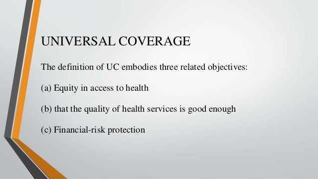 Isang malawakang reporma sa sektor ng kalusugan na naglalayong bigyan ng access ang lahat ng Filipino sa de-kalidad at abot-kayang serbisyong pangkalusugan nang walang dapat ipangamba sa gastusin. Universal healthcare coverage refers to systems in which all residents of a particular geographical area or country have health insurance. It is organized around providing a specified package of benefits to all members of a society with the end.